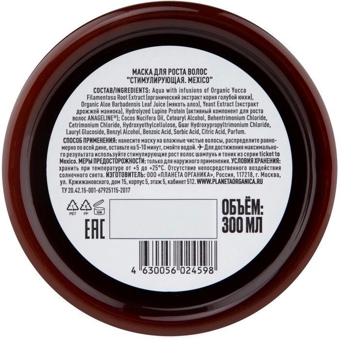 - PLANETA ORGANICA МАСКА ДЛЯ РОСТА ВОЛОС СТИМУЛИРУЮЩИЙ TICKET TO MEXICO - питает волосы по всей длине, стимулирует спящие волосяные луковицы, разглаживает волосы, придаёт им гладкость и блеск.