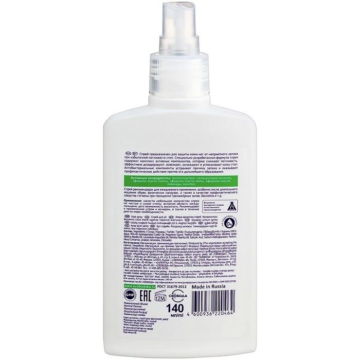 - Спрей предназначен для защиты кожи ног и обуви от неприятного запаха при избыточной потливости стоп.