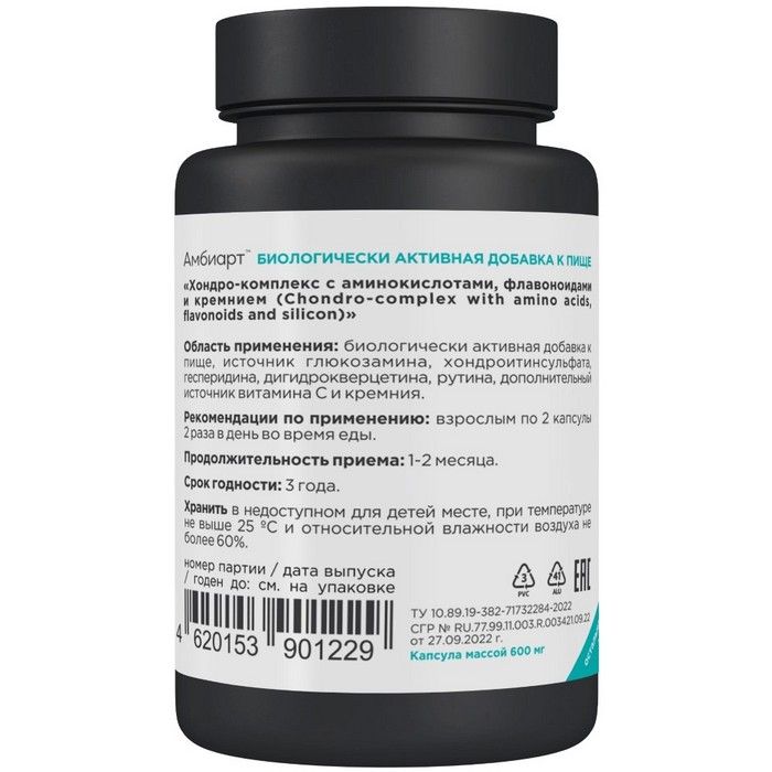 - Амбиарт (с) биологически активная добавка «Хондро-комплекс с аминокислотами, флавоноидами и кремнием» разработан для коррекции обмена веществ хрящевой ткани, укрепления суставов, костей, связок.