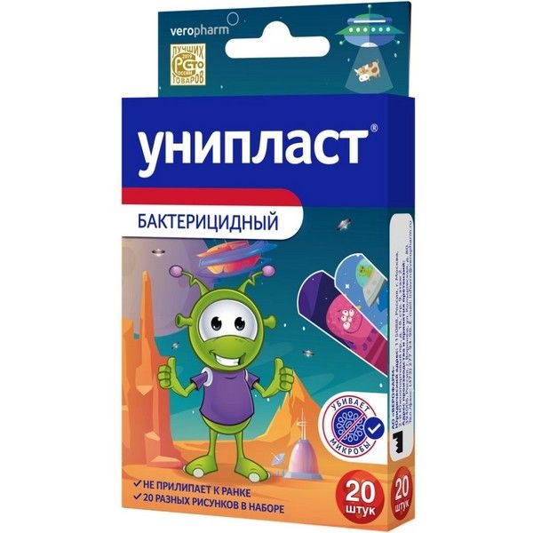 Лейкопластырь бактерицидный УНИПЛАСТ "Космический" набор (1,6х5,7см №8 и 1,9х7,2см №12) №20 (плен.) Верофарм/Россия