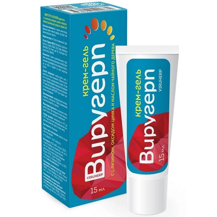 - ВИРУГЕРП (VIRUHERP) крем-гель с L-лизином, оксидом цинка и маслом чайного дерева для ухода за кожей губ.
