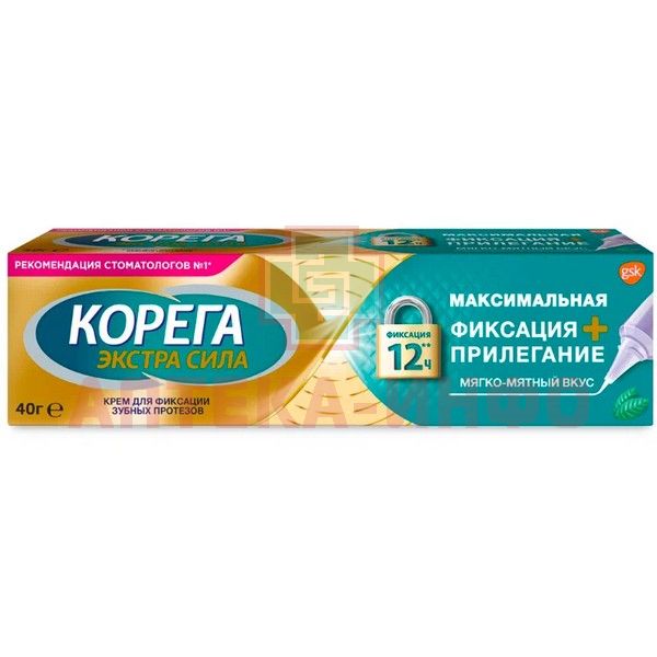 - Клинически доказано, что крем для фиксации зубных протезов Корега Максимальная Фиксация + Прилегание Мягко-Мятный вкус обеспечивает фиксацию зубного протеза до 12 часов**.