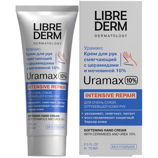 - LIBREDERM URAMAX смягчающий крем для рук с церамидами и мочевиной 10%.