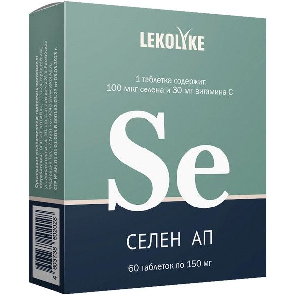 - LEKOLIKE СЕЛЕН АП - Биологически активная добавка (БАД) к пище - создан для защиты организма от свободных радикалов. Активируя важнейшие звенья антиоксидантной системы, СЕЛЕН АП предотвращает цепную реакцию и образование новых агрессивных молекул, нейтрализует их негативное воздействие на человека.