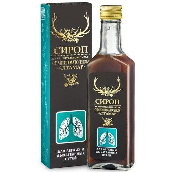 Сахар-песок, вода питьевая, плоды рябины обыкновенной, плоды калины, плоды малины, пантогематоген сухой «Алтамар», плоды кориандра, трава кипрея (иван-чай), корень солодки, листья подорожника, почки сосны, листья мяты перечной, листья мать-и-мачехи, корень алтея, листья подорожника большого, цветки ромашки аптечной, трава душицы обыкновенной, трава чабреца, тимьян ползучий, трава и цветки эхинацеи, мед, лимонная кислота Е330, аскорбиновая кислота Е300.Рекомендации по применению