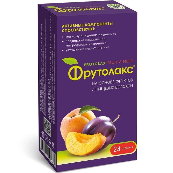 - "ФРУТОЛАКС" на основе фруктов и пищевых волокон способствует регулярности дефекации и формированию стула нормальной консистенции. Благодаря комбинации активных веществ 4 растительных компонентов, "ФРУТОЛАКС" способствует усилению перистальтики, улучшению эвакуаторной функции кишечника, обладает очищающими и сорбционным свойствами. Капсула содержит 99% компонентов растительного происхождения (на основе фруктов абрикоса, сливы, ревеня и свеклы). Не содержит сенны (бережное действие) Мягкое действие в ночное время, действие наступает через 8-10 часов после приёма.
