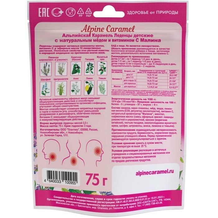 - ALPINE CARAMEL ЛЕДЕНЦЫ АЛЬПИЙСКАЯ КАРАМЕЛЬ ДЕТСКИЕ С НАТУРАЛЬНЫМ МЕДОМ И ВИТАМИНОМ С СО ВКУСОМ МАЛИНЫ - Биологически активная добавка (БАД) к пище