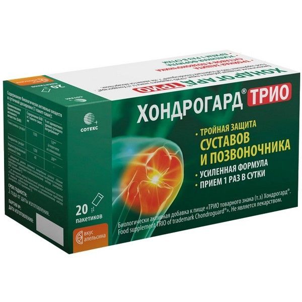 - ТРИО т.з. Хондрогард® БАД к пище - уникальная комбинация хондроитина сульфата, глюкозамина сульфата и нативного коллагена, которые способствуют защите суставного хряща от разрушения, сохранению подвижности суставов и позвоночника.