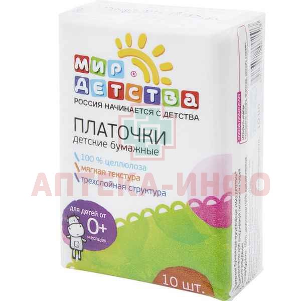 Платочки детские Мир Детства - бумажные трёхслойные, изготовлены без применения хлора. Мини-упаковка содержит 10 платочков, удобна для маминой сумочки.