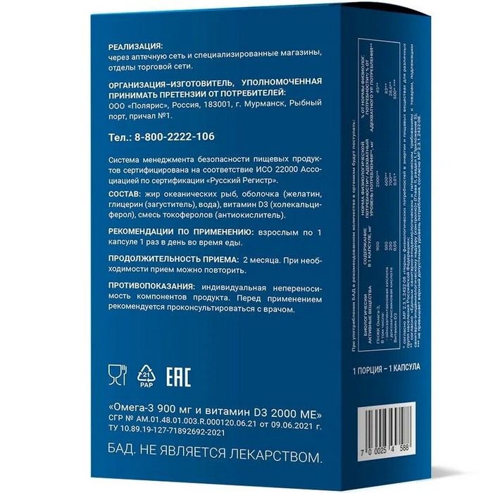 Омега-3 900мг + Витамин Д3 2000МЕ капс. №30 Полярис