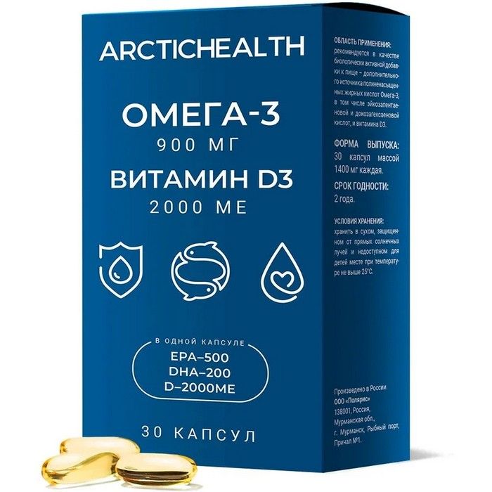 - • Для производства комплекса ARCTICHEALTH® «Омега-3 900 мг и витамин D 2000 МЕ» используется исландский рыбий жир из тушек диких океанических рыб.