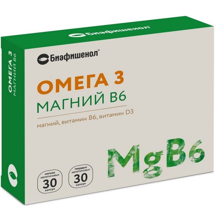 - БИАФИШЕНОЛ ОМЕГА 3 МАГНИЙ B6 N30 КАПС ПО 0,35Г+N30 КАПС ПО 0,6Г - Биологически активная добавка (БАД) к пище