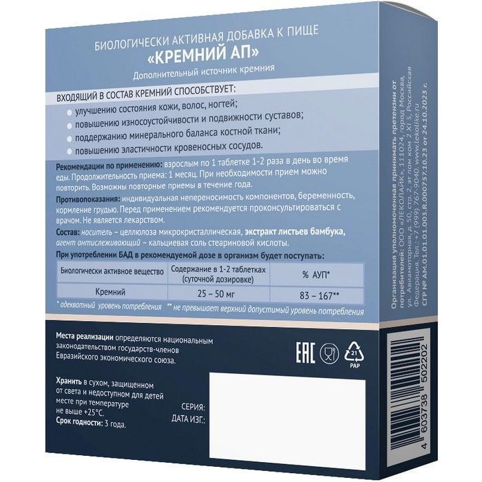 - КРЕМНИЙ АП - в 1 таблетке: Кремний - 25 мг.