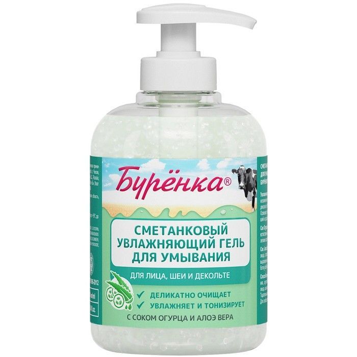 - Лошадиная сила Буренка Сметанковый увлажняющий гель для умывания с соком Огурца и Алоэ вера в пластиковом флаконе с дозатором.