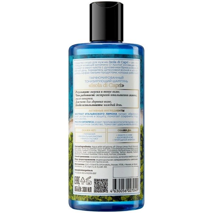 - PLANETA ORGANICA ШАМПУНЬ ПАРФЮМИРОВАННЫЙ ТОНИЗИРУЮЩИЙ ISOLA DI CAPRI - средства ухода для мужчин Isola di Capri - это настоящая инъекция витамина С! Аромат коллекции погружает в океан чувств с дуновением бриза в жаркий летний день.