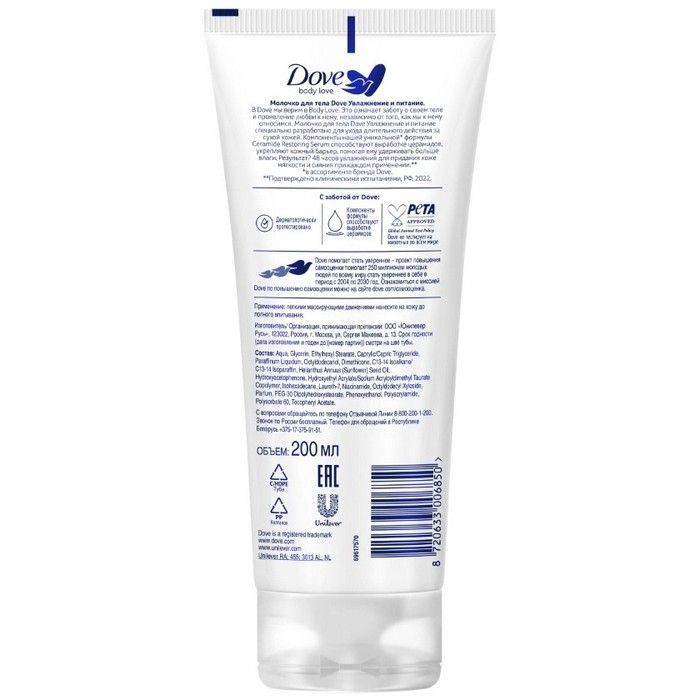 - Увлажняющее и питающее молочко для тела Dove - идеальный продукт для ежедневного использования. Его так приятно нанести после душа, чтобы увлажнить и напитать кожу полезными ингредиентами, которые позволяют сохранить и поддержать необходимый уровень увлажненности, укрепляя и восстанавливая липидный барьер.