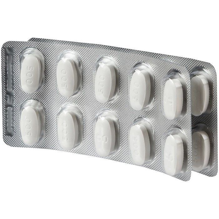 - Таблетки овальной формы, покрытые пленочной оболочкой, от белого до почти белого цвета. С гравировкой «g» на одной стороне и «500» на другой стороне. На поперечном разрезе ядро таблетки белого или почти белого цвета