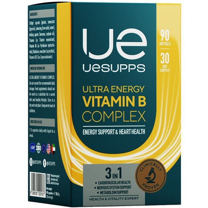 Комплекс витаминов группы В Ultra Energy Vitamin B Complex от UESUPPS. Уникальная формула комплекса от компании UESUPPS включает в себя важнейшие для организма витамины B1, B2, B6, B12. Витамины группы В необходимы для правильной работы нервной и сердечно-сосудистой системы, здоровья кожи, ногтей и волос. Недостаток этих витаминов вызывает снижение иммунитета и памяти, хроническую усталость, подавленность и раздражительность, выпадение волос и сухость кожи.