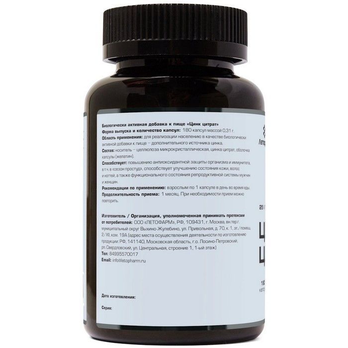 - ЦИНК ЦИТРАТ /ЛЕТОФАРМ - Биологически активная добавка (БАД) к пище - способствует: повышению антиоксидантной защиты организма и иммунитета, вт.ч.в «сезон простуд», способствует улучшению состояния кожи, волос и ногтей, а также функционального состояния репродуктивной системы мужчин и женщин.