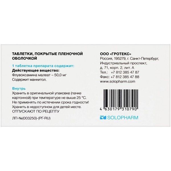 - Одна таблетка препарата содержит 50 мг флувоксамина малеата.