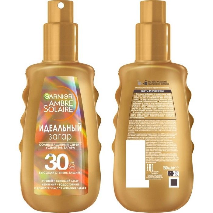 - Солнцезащитный спрей-проявитель загара Garnier Ambre Solaire Идеальный загар SPF 30 стимулирует естественную выработку меланина и обеспечивает быстрый ровный и стойкий загар.