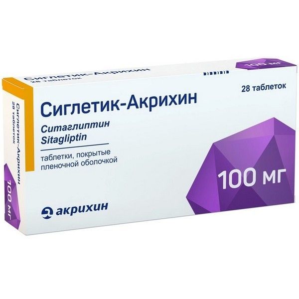 - Сиглетик-Акрихин содержит активное вещество ситаглиптин. Ситаглиптин способен снижать уровень сахара в крови у взрослых пациентов с сахарным диабетом 2 типа, за счет подавления фермента DPP-4 (дипептидилпептидаза-4).