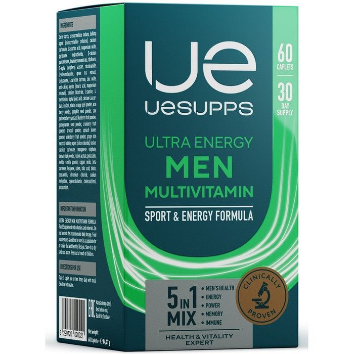 Комплекс витаминов для мужчин Ultra Energy Men Multivitamin Formula разработан компанией UESUPPS специально для активных мужчин. Этот суперкомплекс включает в себя более 50 наиболее важных для здоровья и энергии ингредиентов, которые обеспечивают баланс витаминов и микроэлементов, сглаживают влияние стрессов, наполняют мужской организм жизненной силой. Продукт прекрасно подойдет жителям мегаполиса, которые постоянно испытывают потребность в витаминах и минералах для легкого пробуждения и высокого уровня энергии, отличной памяти, правильного метаболизма, стойкого иммунитета, мужского здоровья и силы. Упаковка включает в себя 60 или 90 каплет.