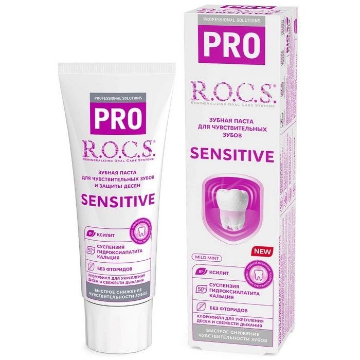 - Зубная паста R.O.C.S. PRO Sensitive для чувствительных зубов обладает тройным механизмом снижения чувствительности зубов и защитой десен от воспаления. В состав пасты входят: