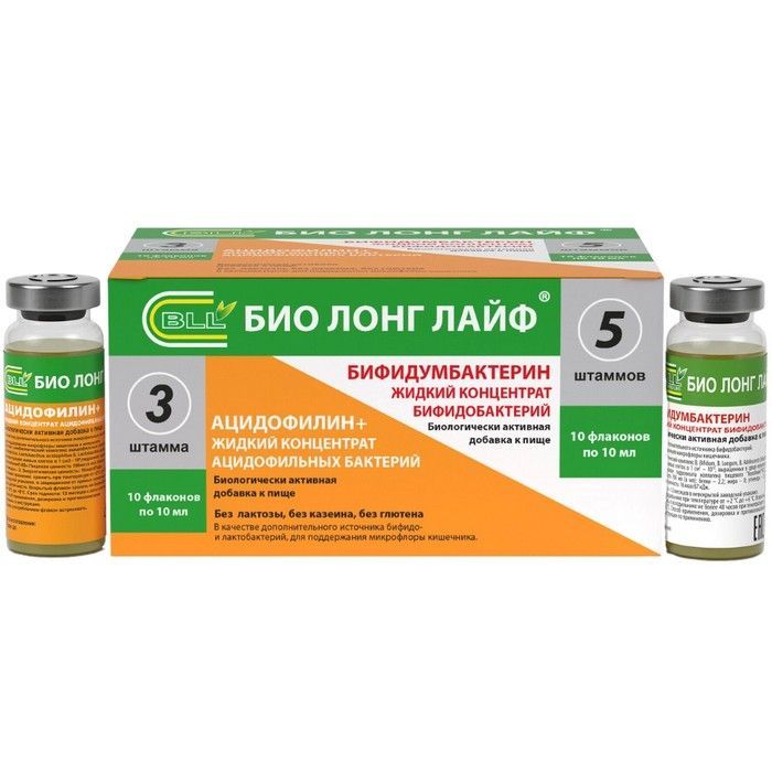 Бифидумбактерин фл.(жидкий концентрат бифидобактерий) 10мл №10 + ацидофиллин + жид. концентрат фл. 10мл №10 Био Лонг Лайф/Россия