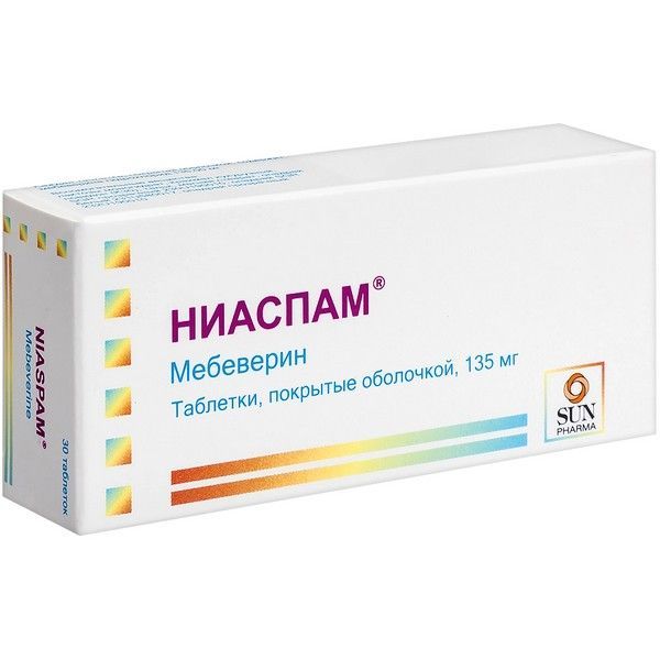 - Препарат Ниаспам® содержит действующее вещество мебеверин, относящееся к группе спазмолитических лекарственных средств.