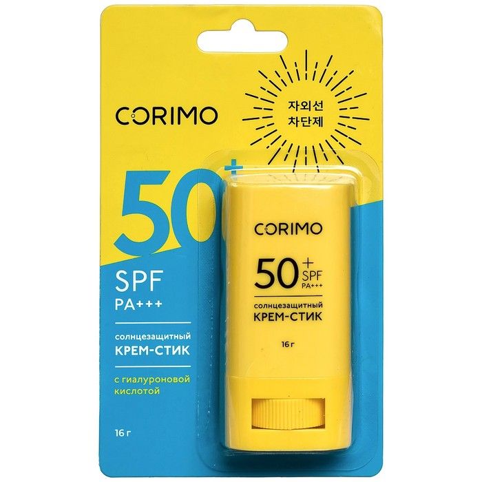 - CORIMO КРЕМ-СТИК С ГИАЛУРОНОВОЙ КИСЛОТОЙ УВЛАЖНЯЮЩИЙ СОЛНЦЕЗАЩИНЫЙ SPF50+ - защита от ожогов и обезвоживания кожи, вызванных солнцем.