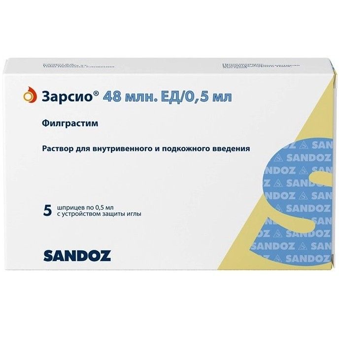 - Препарат Зарсио® выпускается в следующих дозах: 30 млн. ЕД/0,5 мл (0,300 мг) и 48 млн. ЕД/0,5 мл (0,480 мг).