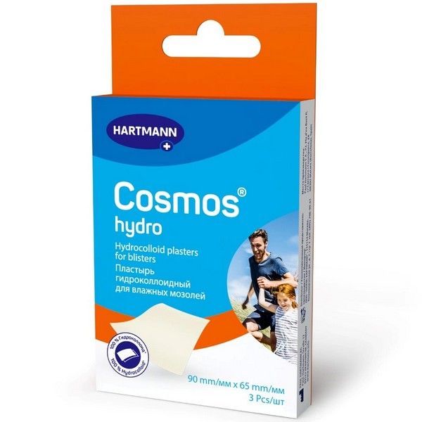 - «Пластырь гидроколлоидный для влажных мозолей Cosmos® hydro» представляет собой неактивное неинвазивное одноразовое, самоклеящееся, нестерильное изделие, состоящее из 100% гидроколлоида, в том числе самоклеящегося гидроколлоидного контактного слоя (функциональной подушечки) при необходимости и в зависимости от формы, материала основы с адгезивным покрытием (материала-носителя), защищенного силиконизированной бумагой.