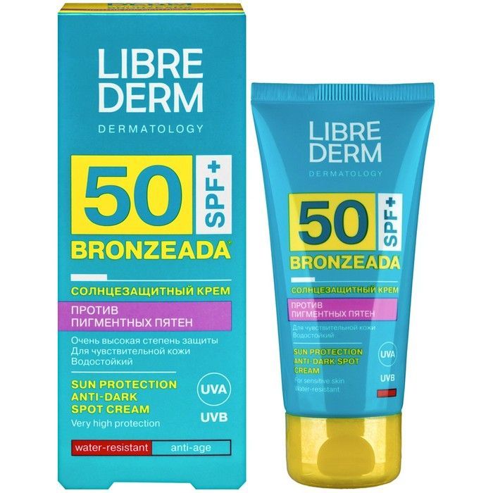 - ЛИБРИДЕРМ БРОНЗИАДА КРЕМ ДЛЯ ЛИЦА И ТЕЛА ПРОТИВ ПИГМЕНТНЫХ ПЯТЕН СОЛНЦЕЗАЩИТНЫЙ SPF 50 - разработан специально для светлой кожи, предрасположенной к образованию веснушек и пигментных пятен