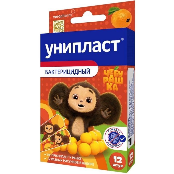 - Лейкопластырь «УНИПЛАСТ® / UNIPLAST® бактерицидный» Чебурашка - набор на основе пленки (с рисунком)