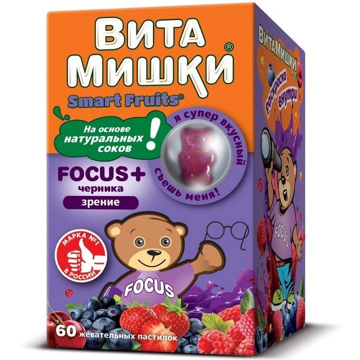 - ВитаМишки® Focus + черника - сбалансированный витаминно-минеральный комплекс в виде вкусных мармеладных пастилок в форме фигурок мишек с вишневым,малиновым, клубничным, черничным вкусами.