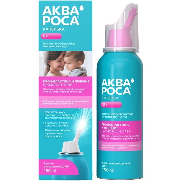 АКВАРОСА КАПЕЛЬКА - это средство на основе рапы (озерной соли) для орошения и промывания полости носа и носоглотки. Изотонический раствор 9 г/л (0,9%)