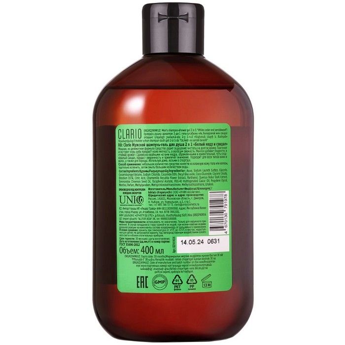 Шампунь-гель CLARIO д/душа муж. 2в1 Белый кедр и сандал 400мл Уник косметик/Россия
