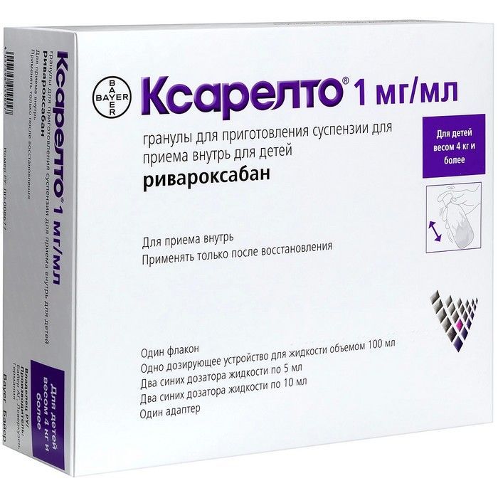 Ксарелто фл.(гран. д/приг. сусп. д/приема внутрь д/дет.) 1мг/мл 5,25г №1 (в компл. с синим шприцем 5мл №2+адаптер №1+шприц 100мл №1) Bayer AG/Германия/Штегеманн Лонферпакунг унд Логистишер-Сервис с.К/Германия