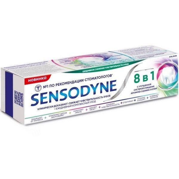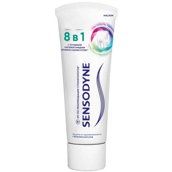 - Стоматологи рекомендуют Sensodyne на протяжении многих лет. Sensodyne 8 в 1 - это фторидсодержащая зубная паста с уникальной формулой, которая подходит для регулярного применения и обеспечивает ежедневный уход за чувствительными зубами.