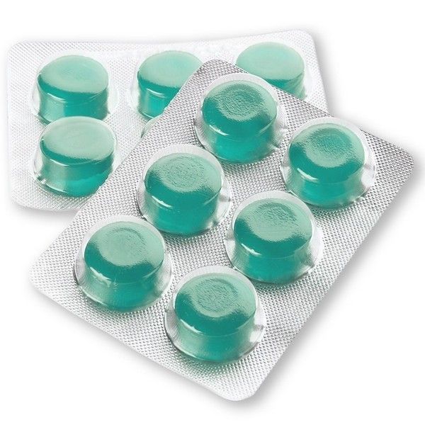 - Внешний вид и свойства: Круглые двояковыпуклые таблетки для рассасывания массой 2,4 г со вкусом эвкалипта-ментола. Допускается неоднородность окрашивания, наличие пузырьков воздуха в карамельной массе и незначительные неровности краёв.