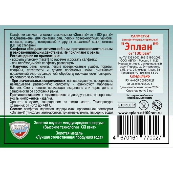 - Салфетки антисептические, стерильные "Эплан"® от "100 ран"® предназначены для санации ран, легких поверхностных ушибов, порезов, ссадин, потёртостей и других поражений кожи, ожогов (I, II, IIIа) степеней