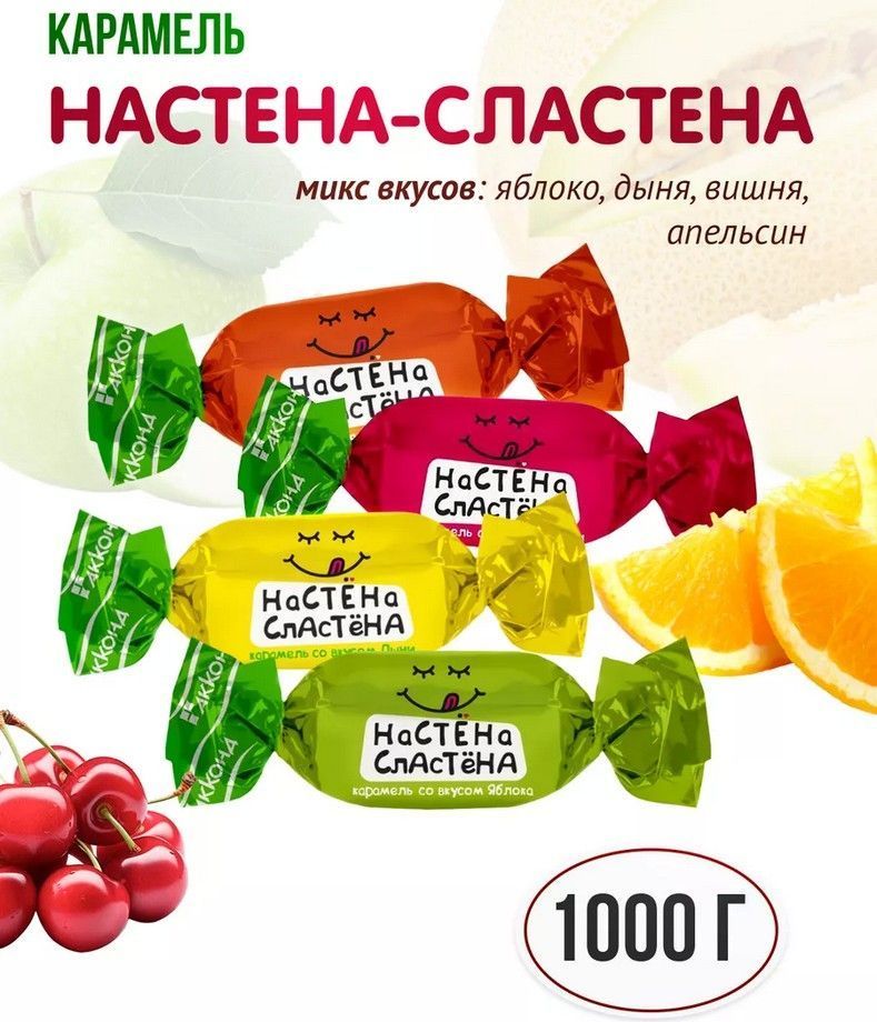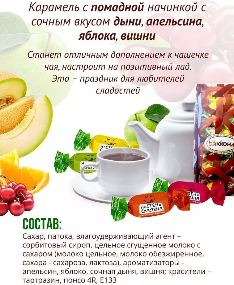 Карамель Настена-сластена со вкусами апельсина, яблока, сочной дыни, вишни. Сочетание вкусов понравится как взрослым, так и детям. Лакомство станет отличным дополнением к чашечке чая, настроит на позитивный лад. Карамель Настена-сластена микс – праздник для любителей сладостей. Покупайте конфеты, карамель, леденцы, вкусные десерты и другие кондитерские изделия от лучших производителей России.