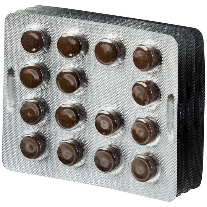 - Внешний вид и свойства: Таблетки круглые, двояковыпуклой или плоскоцилиндрической формы. Цвет таблеток темно-коричневый, допускаются вкрапления, мраморность.