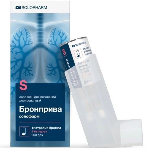- Препарат Бронприва солофарм содержит действующее вещество тиотропия бромид, который является бронходилататором длительного действия. Тиотропия бромид способствует выраженному и продолжительному расширению дыхательных путей и облегчению процесса дыхания.