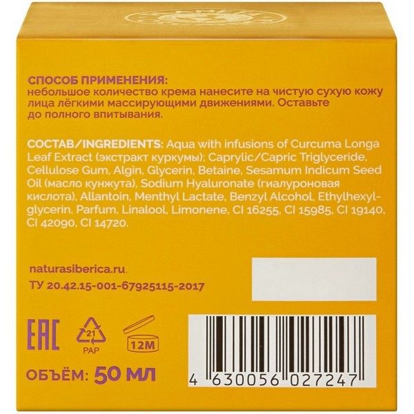 - Aqua with infusions of Сurcuma Longa Leaf Extract (экстракт куркумы); Caprylic/Capric Triglyceride, Cellulose Gum, Algin, Glycerin, Betaine, Sesamum Indicum Seed Oil (масло кунжута), Sodium Hyaluronate (гиалуроновая кислота), Allantoin, Menthyl Lactate, Benzyl Alcohol, Ethylhexylglycerin, Parfum, Linalool, Limonene, CI 16255, CI 15985, CI 19140, CI 42090, CI 14720.