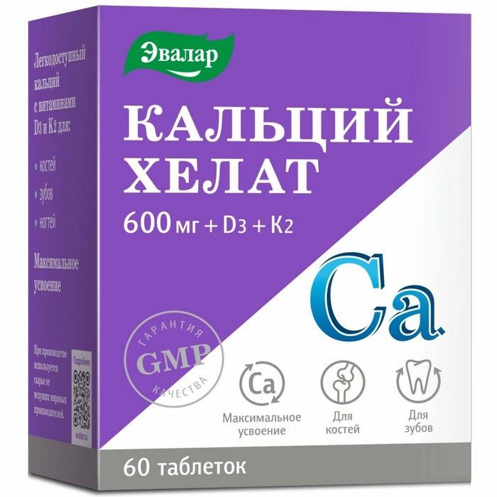 Для максимального усвоения кальция попробуйте легкодоступный хелатный комплекс «Кальций хелат Эвалар». Рекомендован взрослым, а также его могут принимать беременные и кормящие женщины. Кальций хелат Эвалар – дополнительный источник кальция, усиленный витаминами D3 и К2.