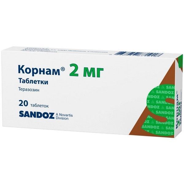 - Перед началом лечения пациентов с ДГПЖ теразозином следует исключить злокачественное новообразование предстательной железы или другие причины, приводящие к задержке мочи. Эффективность проводимой терапии оценивают через 4-6 недель лечения поддерживающими дозами препарата Корнам