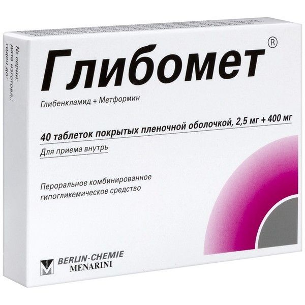 - Действующие вещества: метформина гидрохлорид - 400,0 мг, глибенкламид - 2,5 мг.