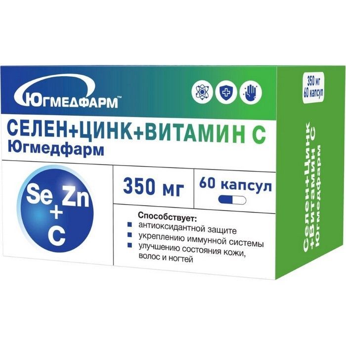 ЮГМЕДФАРМ СЕЛЕН+ЦИНК+ВИТАМИН С - Биологически активная добавка (БАД) к пище - Комбинация оказывает стимулирующее действие на организм, способствует антиоксидантной защите, укреплению иммунитета, улучшению состояния кожи, волос и ногтей, а также повышению сопротивляемости к инфекциям.